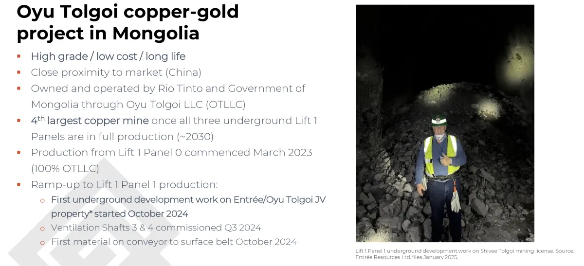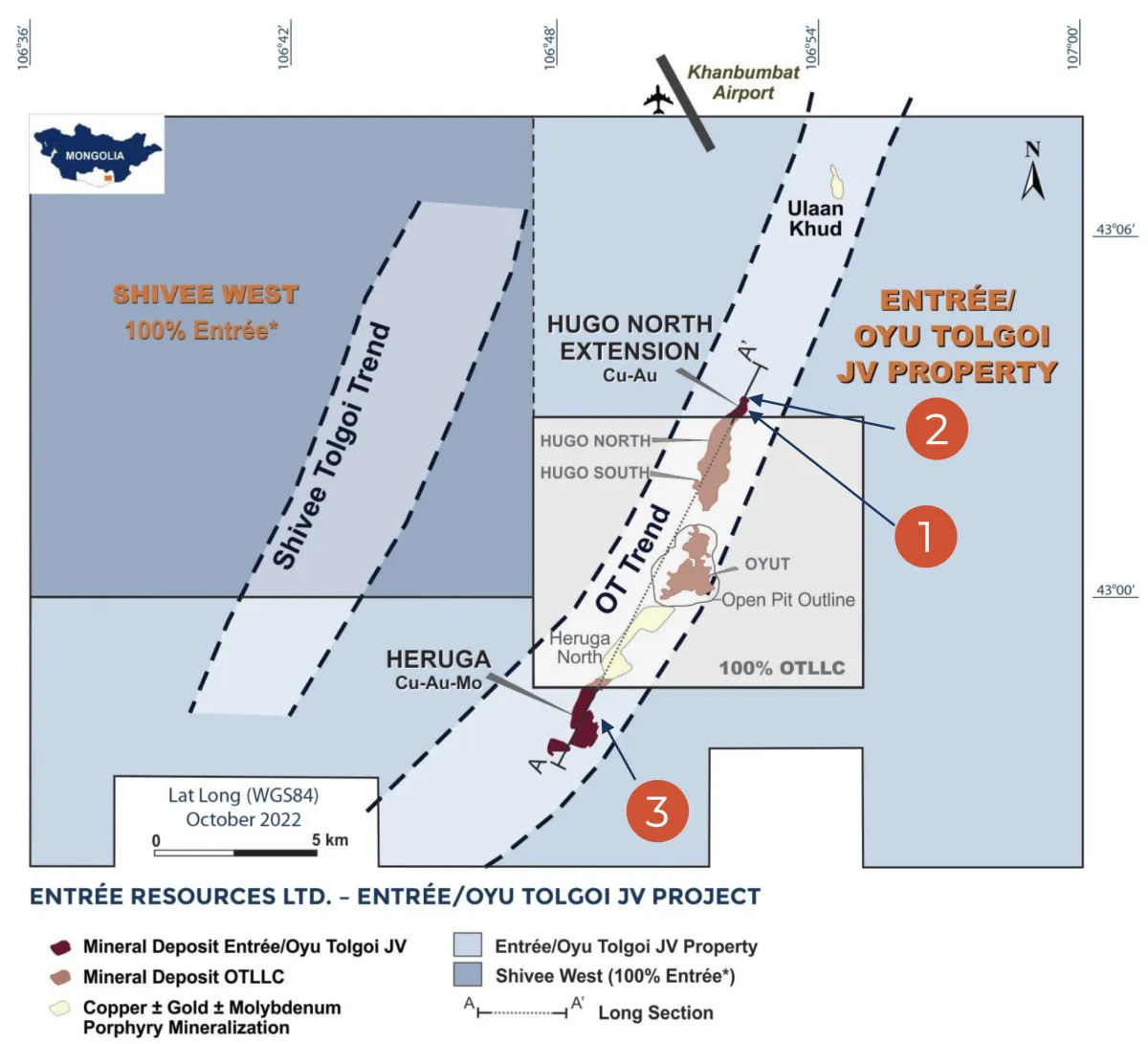 The Entrée/Oyu Tolgoi joint venture property includes Lift 1 and Lift 2 of the Hugo North Extension copper-gold deposit, the Heruga copper-gold-molybdenum deposit, and a large underexplored, highly prospective land package. Rio Tinto is managing the ramp-up of the Hugo North (including Hugo North Extension) Lift 1 underground mine on both the Oyu Tolgoi mining licence and the Entrée/Oyu Tolgoi joint venture property. In March 2023, Rio Tinto announced the commencement of underground production from Lift 1 Panel 0 on the Oyu Tolgoi mining licence (100% Oyu Tolgoi LLC). The Hugo North Extension deposit on the Entrée/Oyu Tolgoi joint venture property comprises the northern portion of Panel 1. First development work on Hugo North Extension Lift 1 is currently expected in H2 2024. First production from the Panel 1 undercut (on the Oyu Tolgoi mining licence) is expected in ~2027.